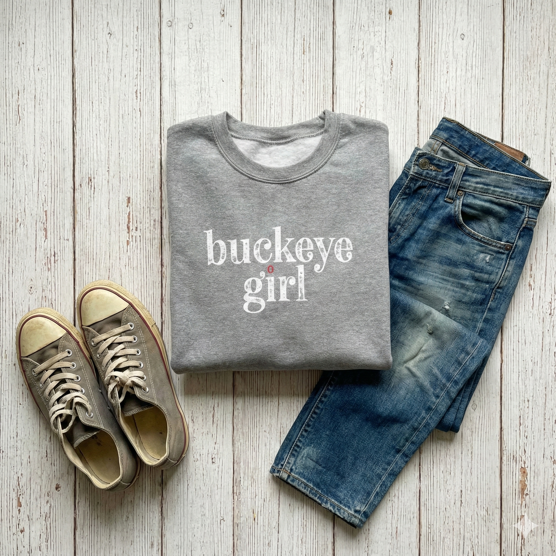 Signature Design: Features a high-contrast "buckeye girl" graphic in a timeless, distressed serif font.