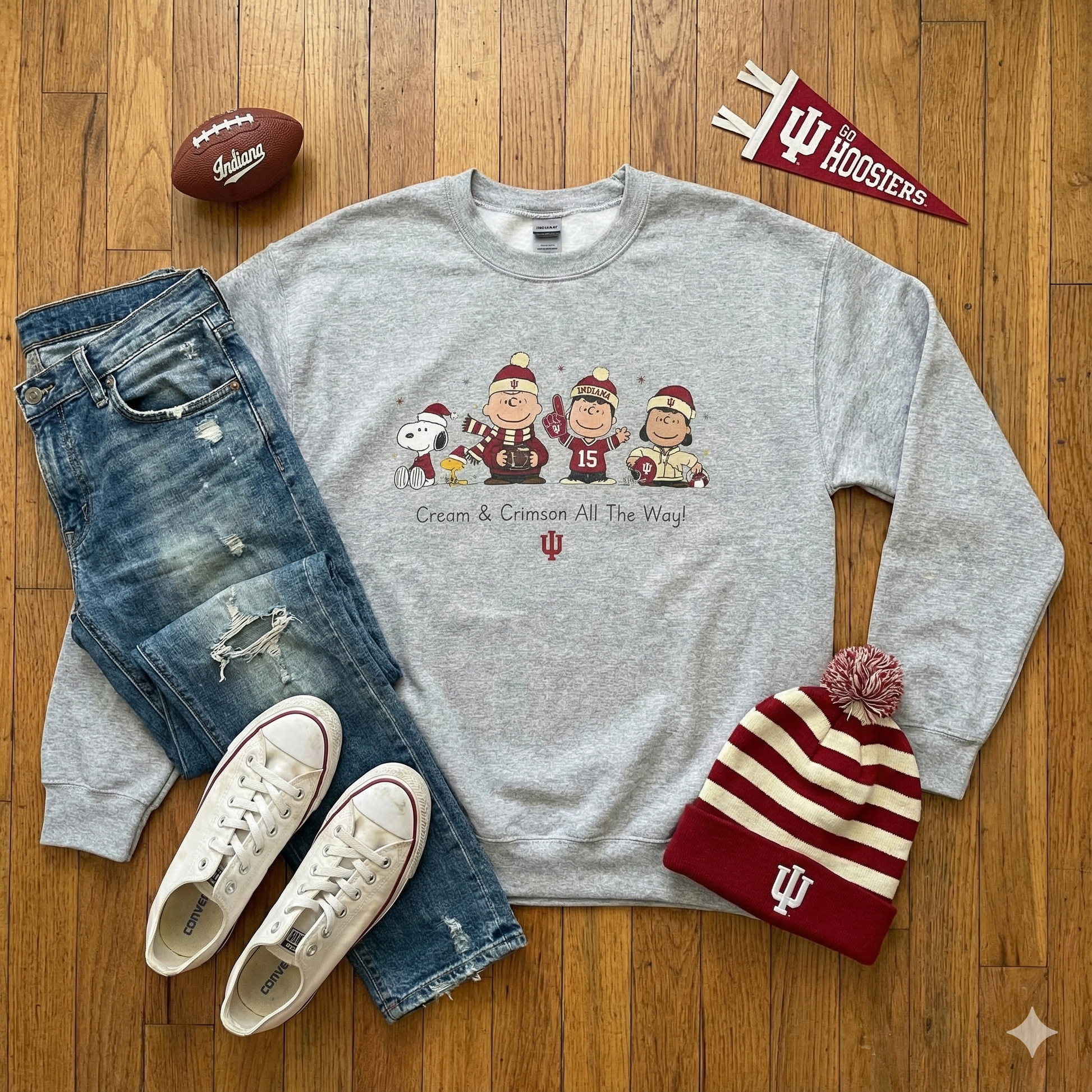 A Cream and Crimson Classic for Bloomington. Celebrate the spirit of the Hoosier State with a playful, vintage-inspired aesthetic from our exclusive Character Collection. This premium crewneck features a lineup of iconic animated friends fully geared up in university beanies, scarves, and crimson-and-white gear. Anchored by a spirited university sentiment and the classic interlocking "IU" logo, this piece perfectly blends nostalgic charm with collegiate pride.