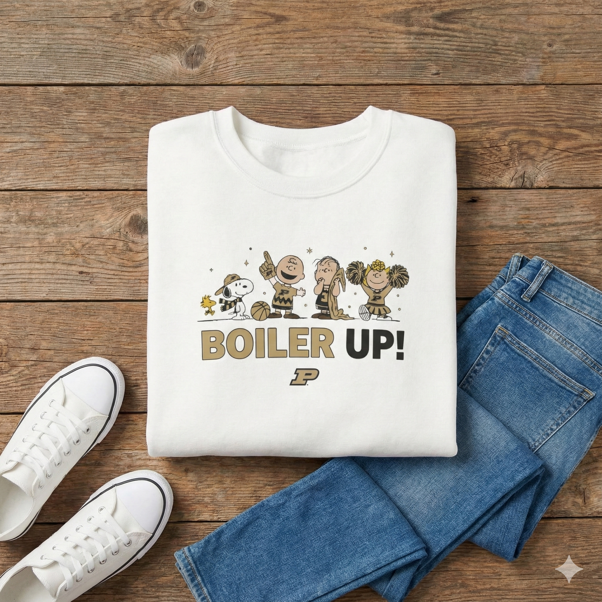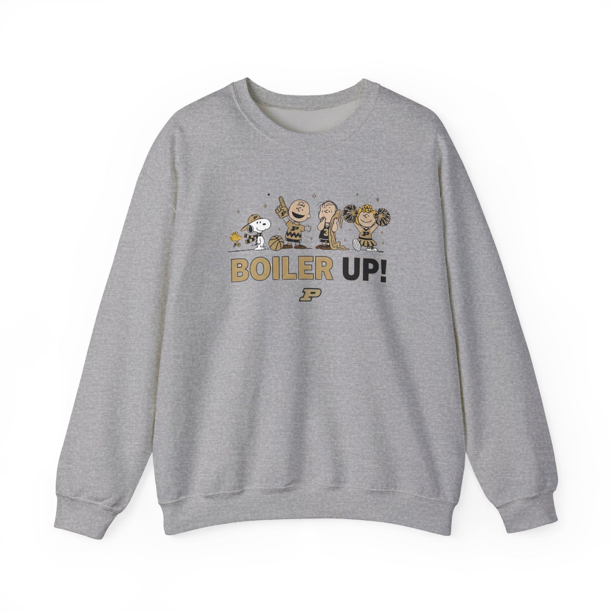 Old Gold and Black Pride for West Lafayette. Celebrate the spirit of the Heartland with a playful, vintage-inspired aesthetic from our exclusive Character Collection. This premium crewneck features a lineup of iconic animated friends fully geared up in university beanies, scarves, and old gold-and-black winter gear. Anchored by a spirited collegiate sentiment and the classic university "P" logo, this piece perfectly blends nostalgic charm with university pride.