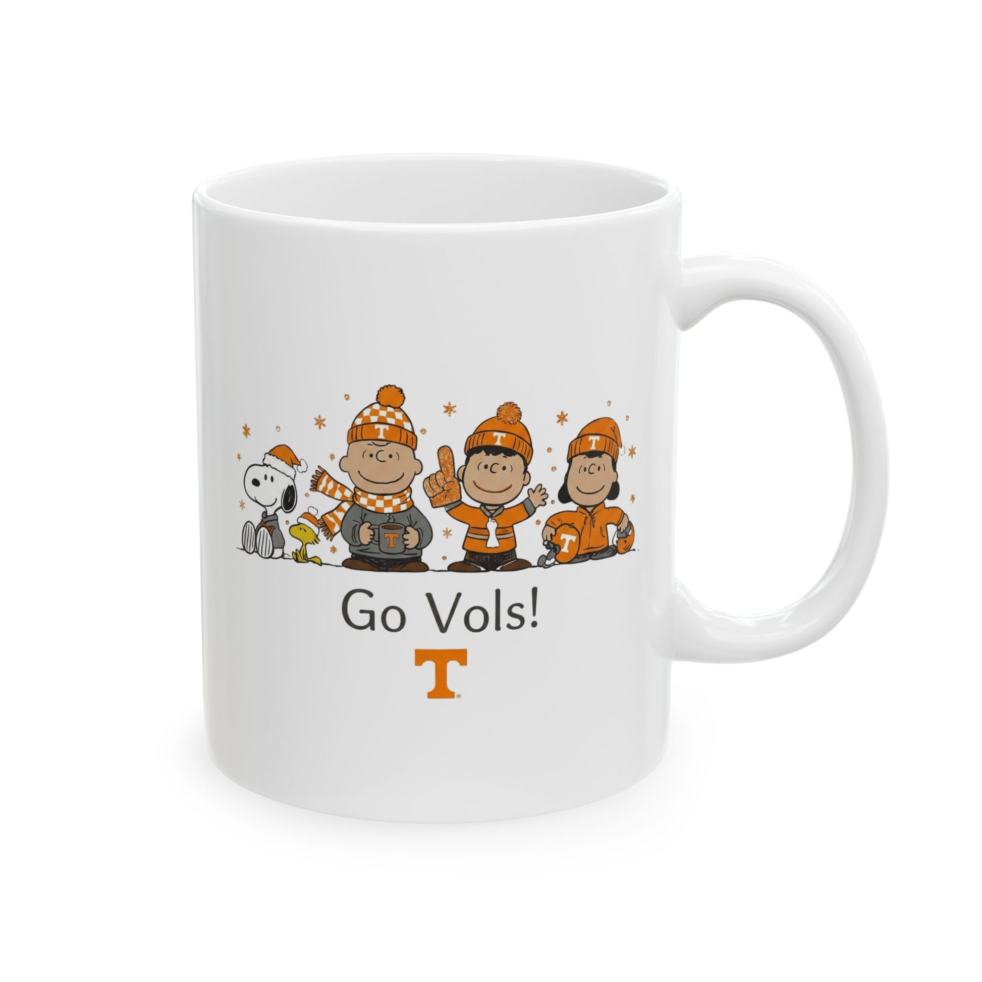 The design showcases a wrap-around graphic of iconic animated friends fully geared up in Tennessee orange and white beanies and scarves. Anchored by the classic university branding and a spirited collegiate sentiment, this cup is a sophisticated yet fun tribute to the university's enduring spirit.