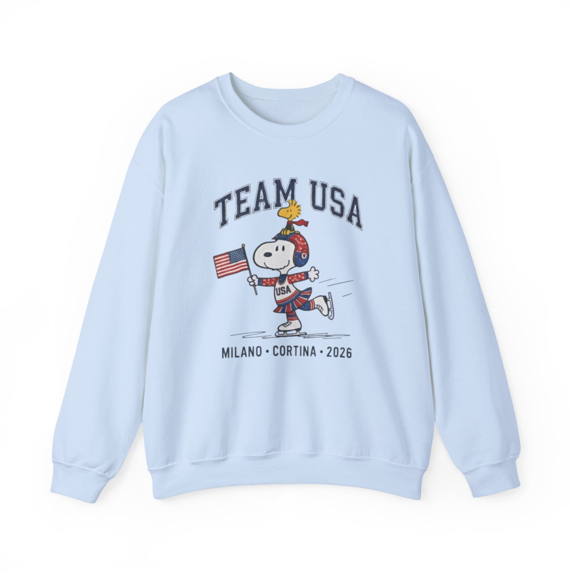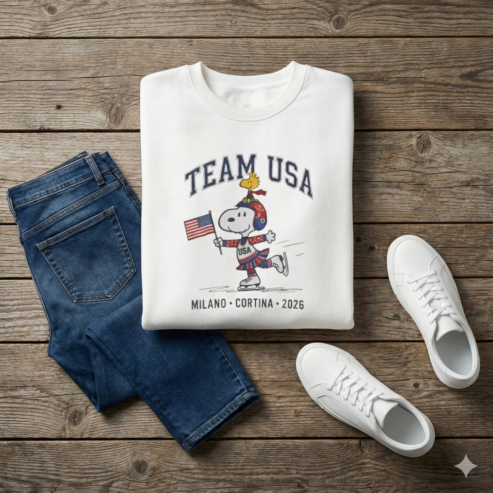 Traditional Spirit with a Playful Heritage. Celebrate the spirit of the Red, White, and Blue with a fresh, vintage-inspired aesthetic from our exclusive Icon Collection. This premium crewneck features a lineup of iconic animated friends fully geared up in patriotic beanies, striped scarves, and winter athletic gear. Anchored by the spirited "USA - Go For Gold!" sentiment and a classic shield logo, this piece perfectly captures a nostalgic sense of national pride.